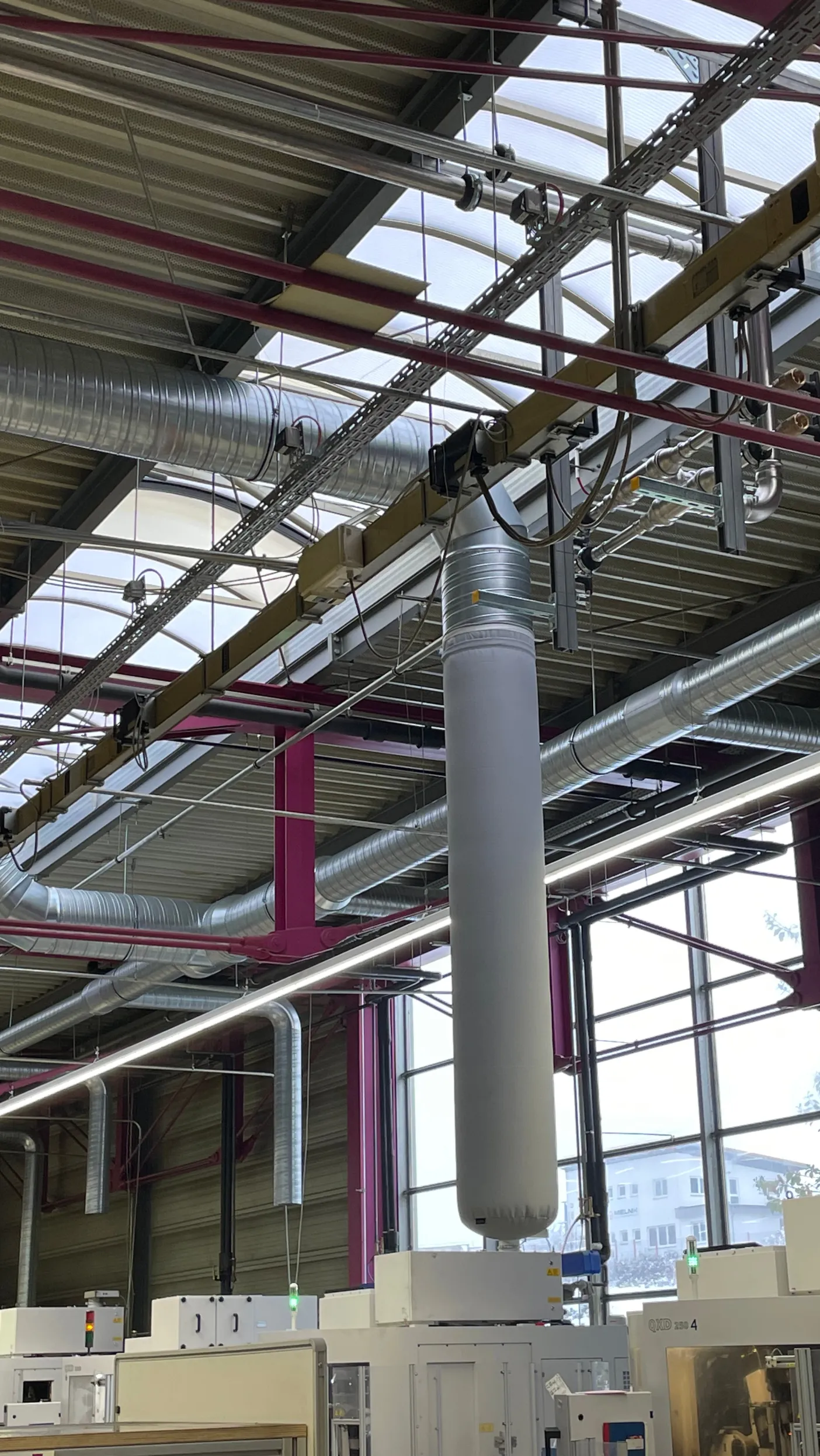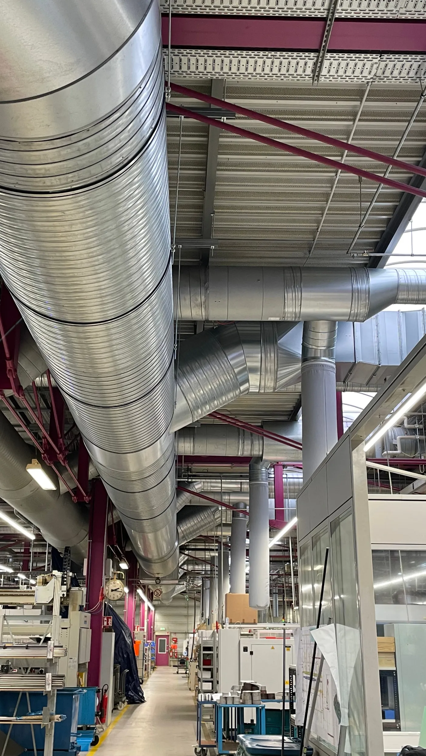 Die gezeigte Installation zeigt unsere Expertise im Bereich industrieller Lüftungstechnik. In Produktions- und Fertigungshallen müssen große Luftmengen zuverlässig transportiert werden – für saubere Arbeitsbedingungen, ein stabiles Raumklima und sichere Maschinenprozesse.