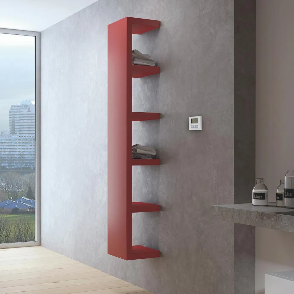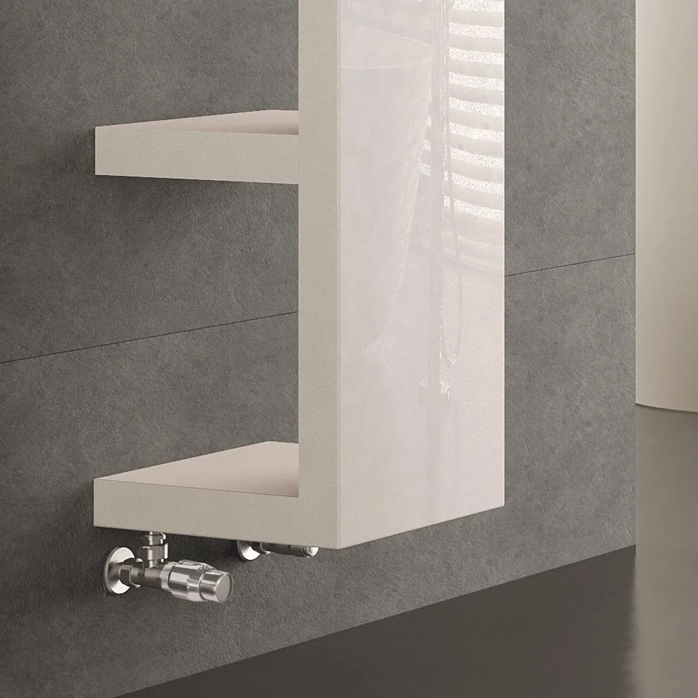 Zur Wand geöffnete Fächer bieten attraktivem Stauraum für Badetücher, Bademantel oder andere Kleidungsstücke. Die Fachböden des Quadraqua werden nicht direkt beheizt. Der leistungsstarke Heizkörper ist in den Maßen 1116 mm und 1828 mm (Höhe) x 300 mm (Breite/Länge) x 300 mm (Tiefe) lieferbar.