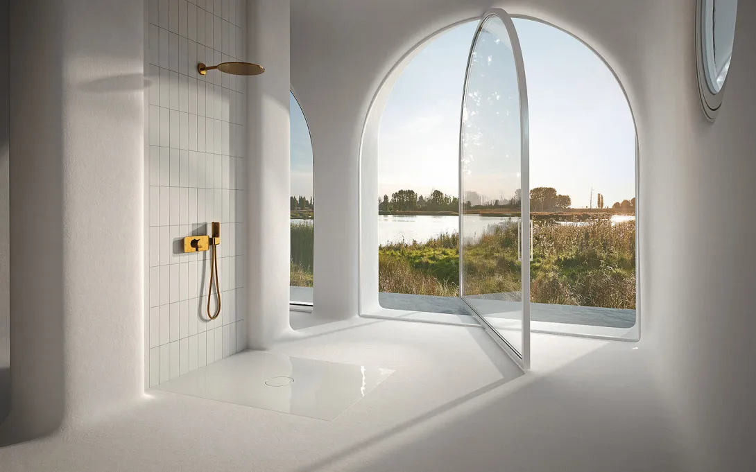 Bodenebene Duschfliese BetteAir in Weiß mit goldener Duscharmatur.
