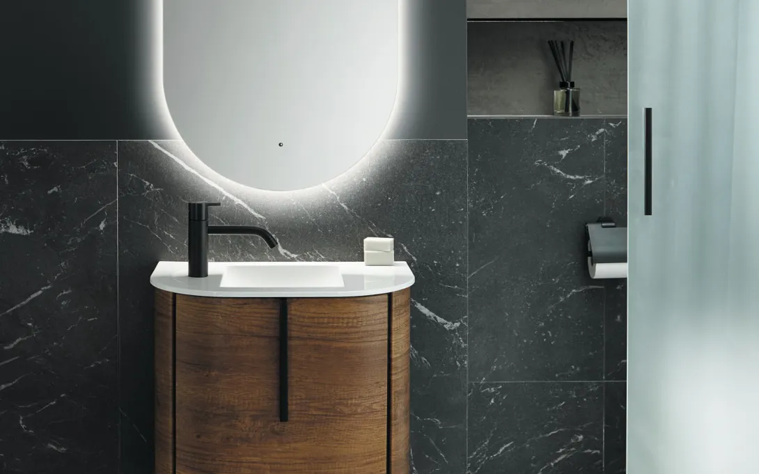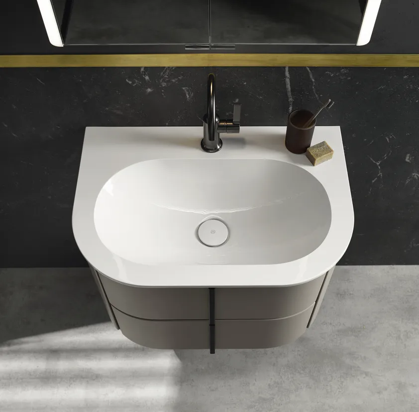 Ob Leuchtspiegel, Thermofronten oder Waschbecken – ovale Rundungen sind das stilprägende Design-Merkmal von Lavo 2.0. Auch die aus Mineralguss gefertigten Waschtische reihen sich in das Konzept ein. Die minimal überstehenden Tische wirken in Kombination mit der schlanken Kante sehr flächenbetont. Im Tisch eingebettet und von einem breiten Rand geschützt, befindet sich das ovalförmige Becken. Je nach Größe sind die Becken unterschiedlich positioniert. Während das Standard-Modell von 720 mm direkt in der Mitte platziert ist, sind größere Modelle rechts- oder linksbündig eingelassen, wodurch eine großzügige, sanft abfallende, seitliche Ablagefläche entsteht.