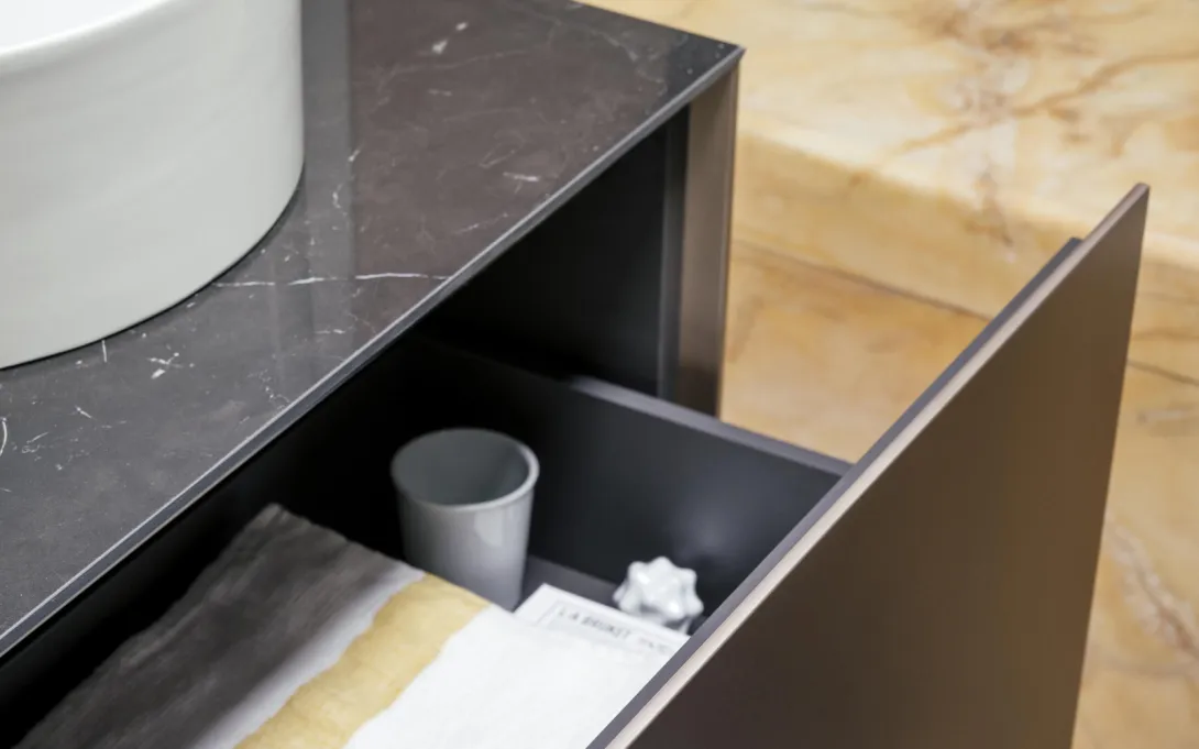 Auf Wunsch gibt es die Waschtische auch mit passenden Unterschränken. Sie sind in den edlen Metallic-Lackierungen Gold, Kupfer und Titanium sowie in einer Oberfläche in Nero Marquina wählbar, einem Kalkstein in Schwarz mit weißer Aderung. Die Farben und das geometrische Design der Möbel kontrastieren perfekt zu den halbrunden oder runden Formen der Waschtische, und sind genau auf deren Maße und Möglichkeiten abgestimmt. Ein Hochschrank stellt zusätzlichen Stauraum im Sonar-Bad zur Verfügung.