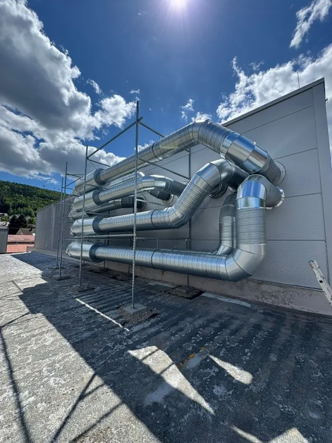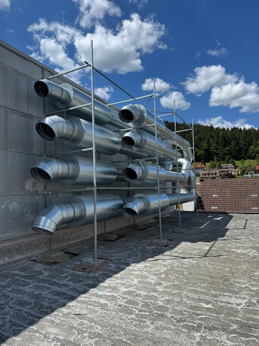 Bei Trocknungsanlagen, Wäschereien, Produktionsbetrieben oder Gewerbeküchen entstehen enorme Abluft- und Dampfvolumen, die sicher, energieeffizient und dauerhaft abgeführt werden müssen. Die gezeigten groß dimensionierten Abluftleitungen zeigen eine unserer typischen Installationen für industrielle Trocknungsabluft und Dampfabführung auf dem Dach eines Gewerbebetriebs.